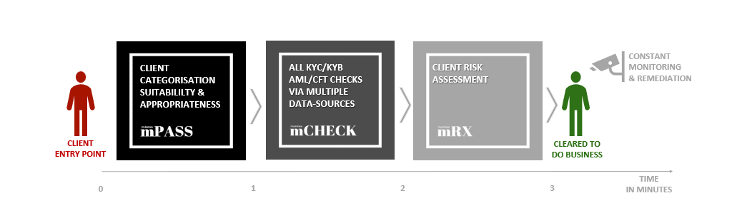 mPASS™ is the only product in the market that harnesses AI to automatically perform suitability and appropriateness checks, client categorisation and all other parts of regulatory onboarding to simply answer the question "Can we offer this client product X with service Y in country Z?"